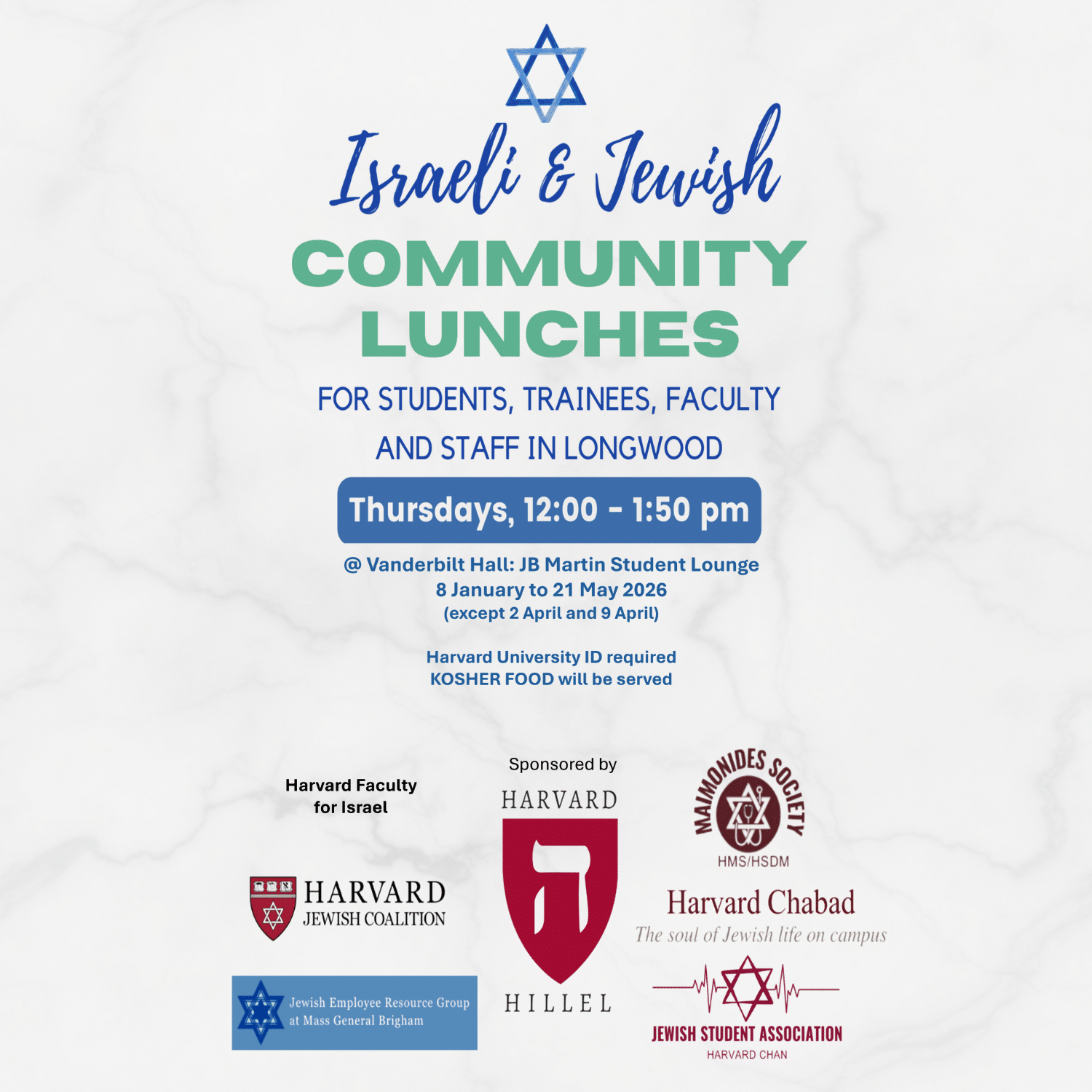 Israeli & Jewish Community Lunches @ LongwoodIsraeli & Jewish Community Lunches Join us for weekly Israeli and Jewish community lunches in Longwood, open to students, trainees, faculty, and staff. Enjoy kosher food and connect with the...