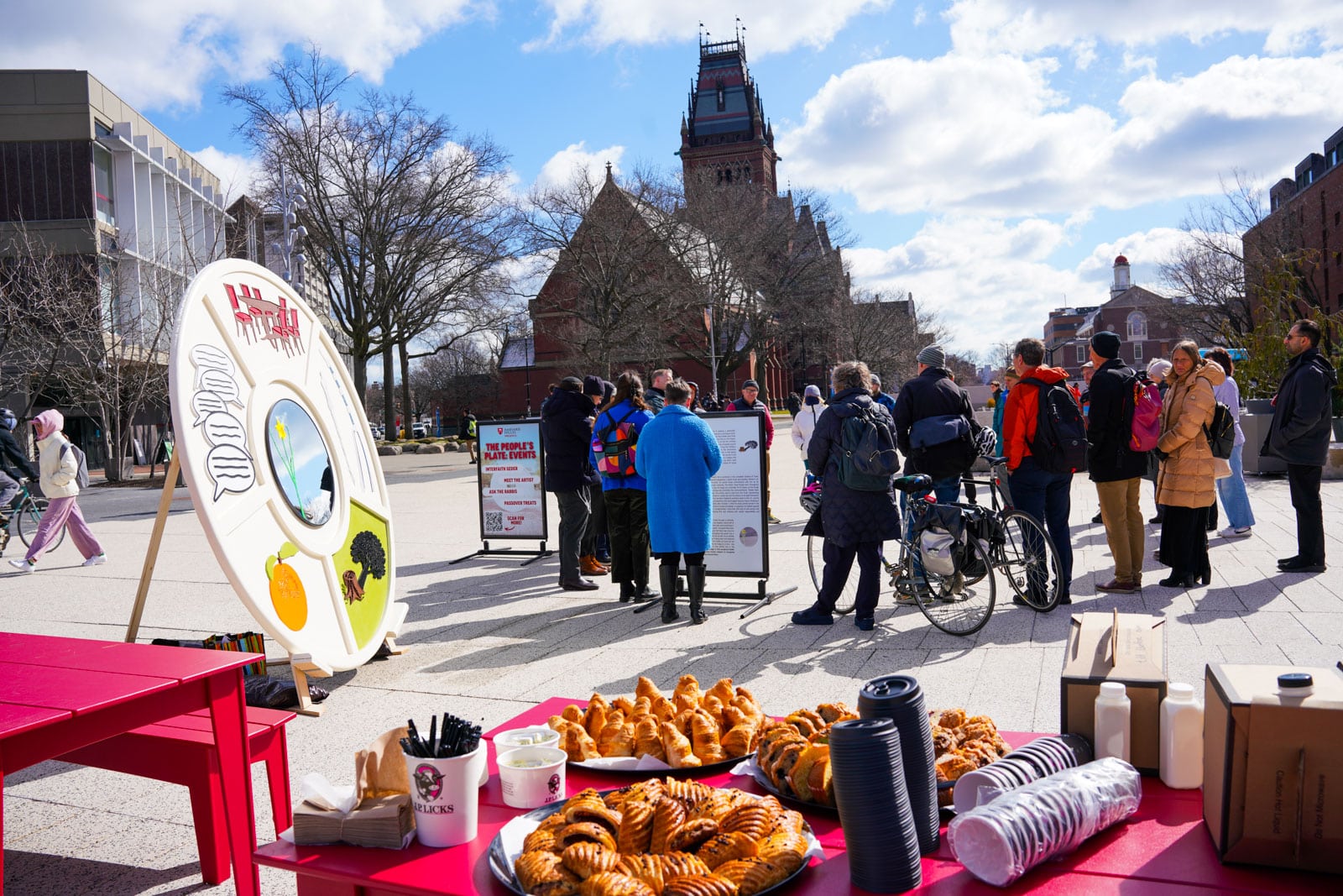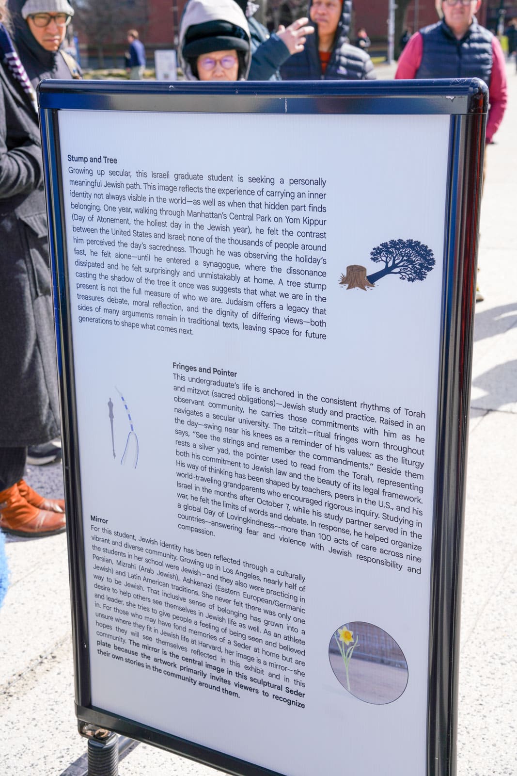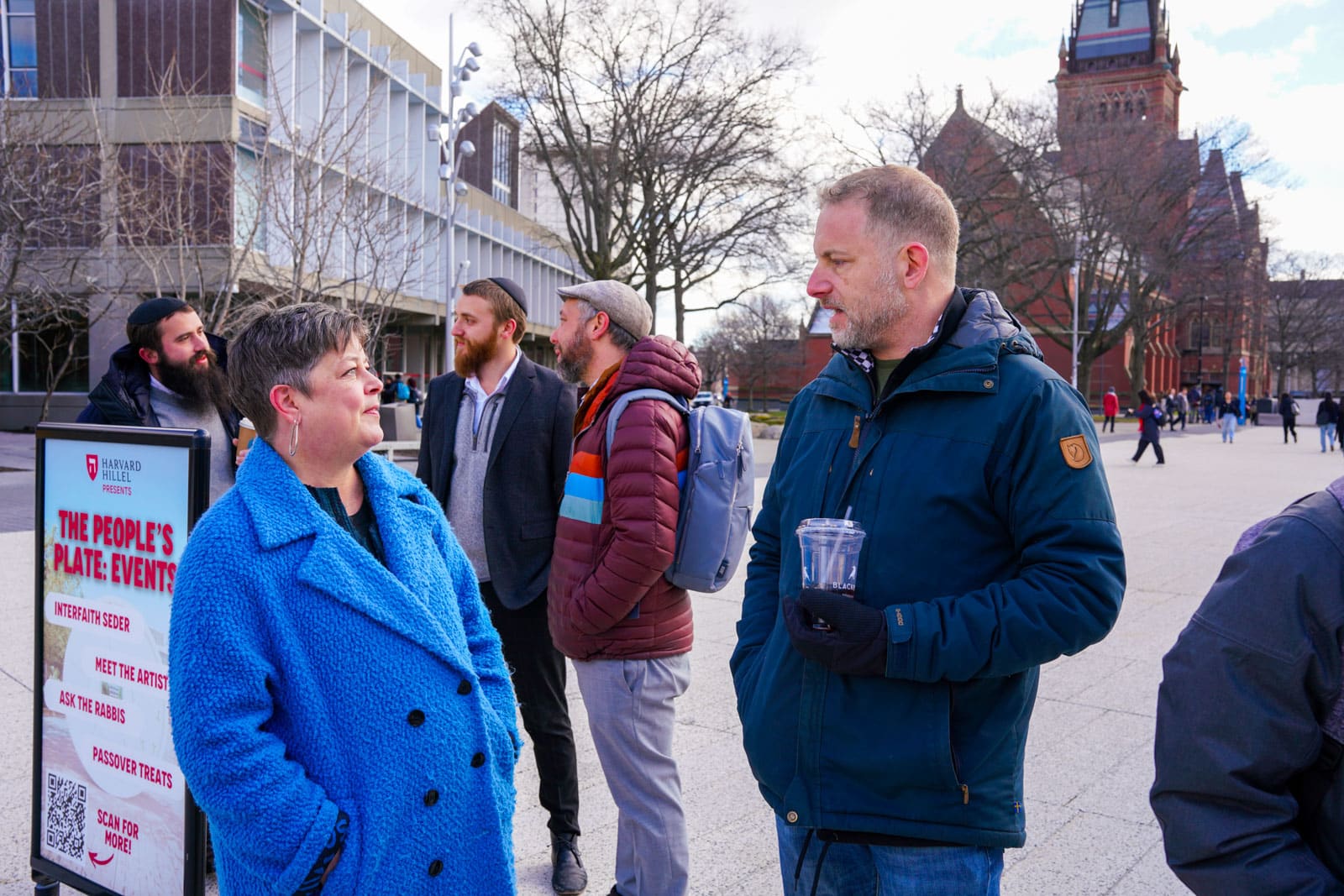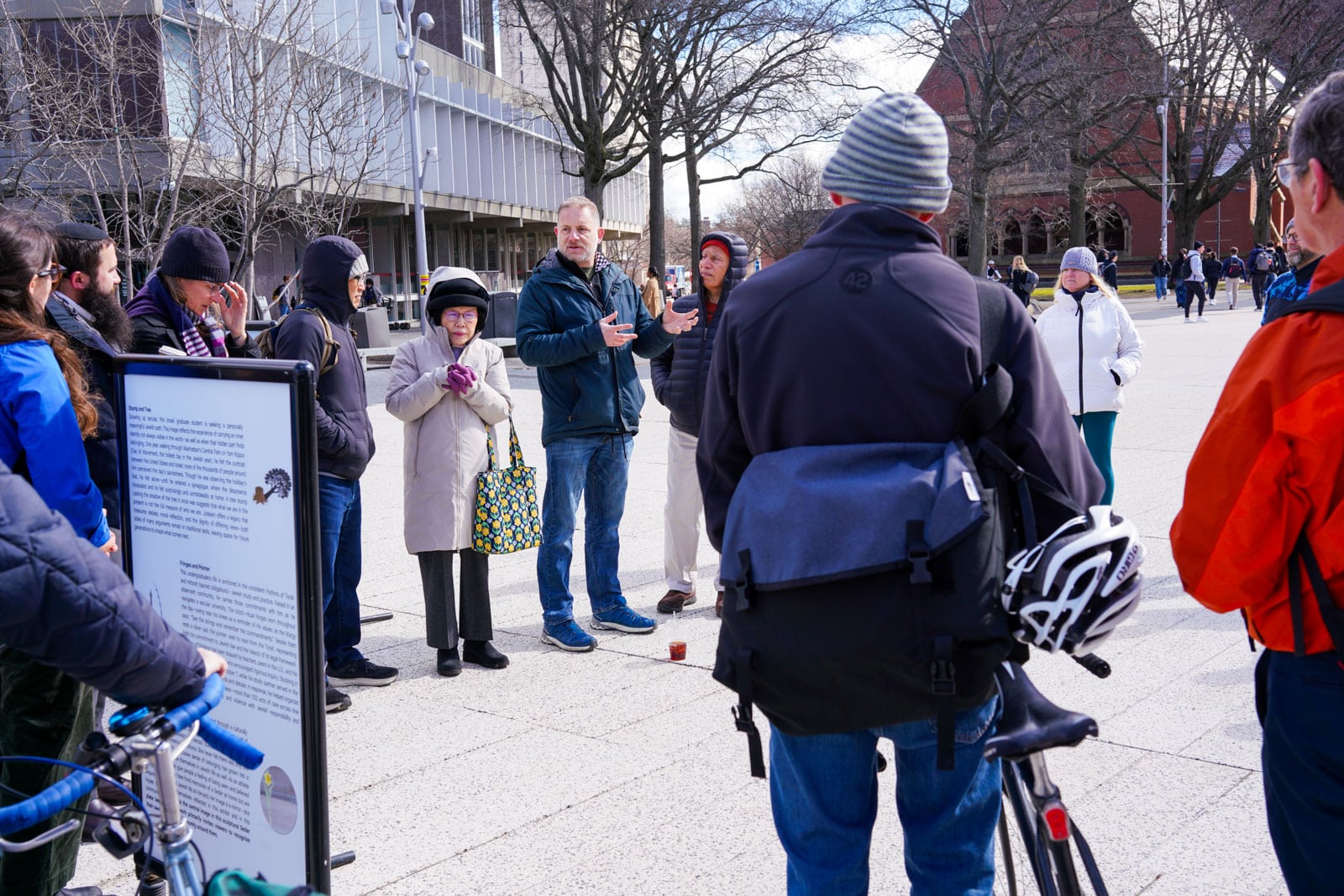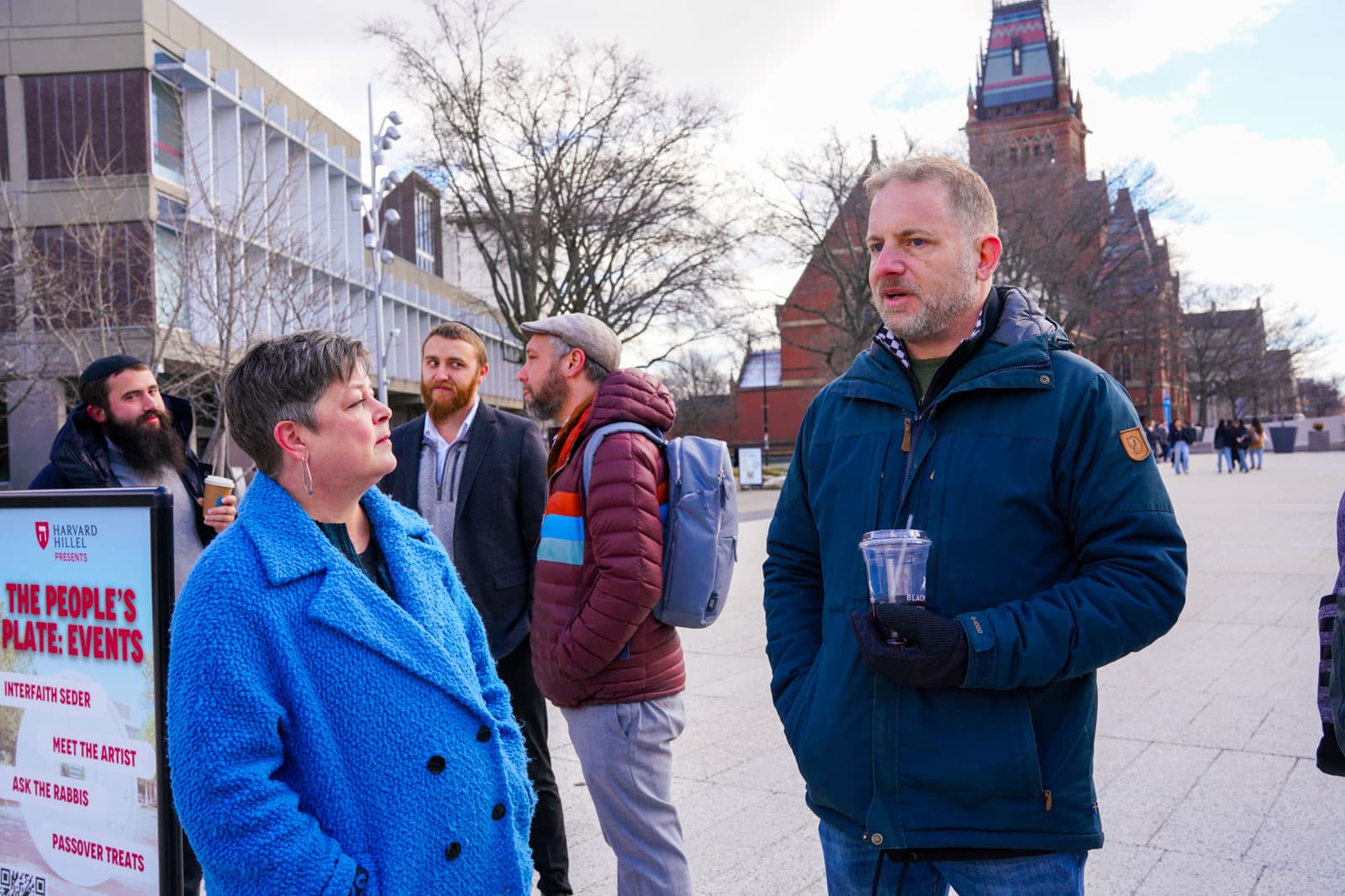 Under the morning sun and alongside the newly installed nine-foot sculpture, dozens of students, chaplains, university staff, and curious passersby stopped to engage directly with artist Michael Mittelman. Over hot coffee and pastries, the artist shared the stories behind the installation’s panels—each representing a unique thread of Jewish identity and belonging at Harvard—while neighbors and colleagues connected through shared conversation and art.