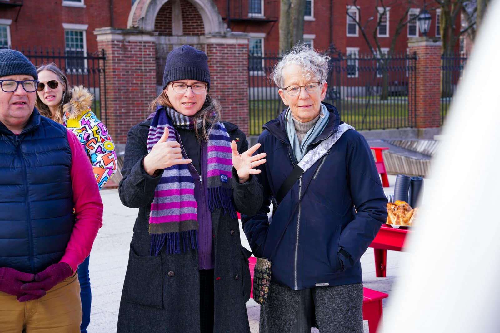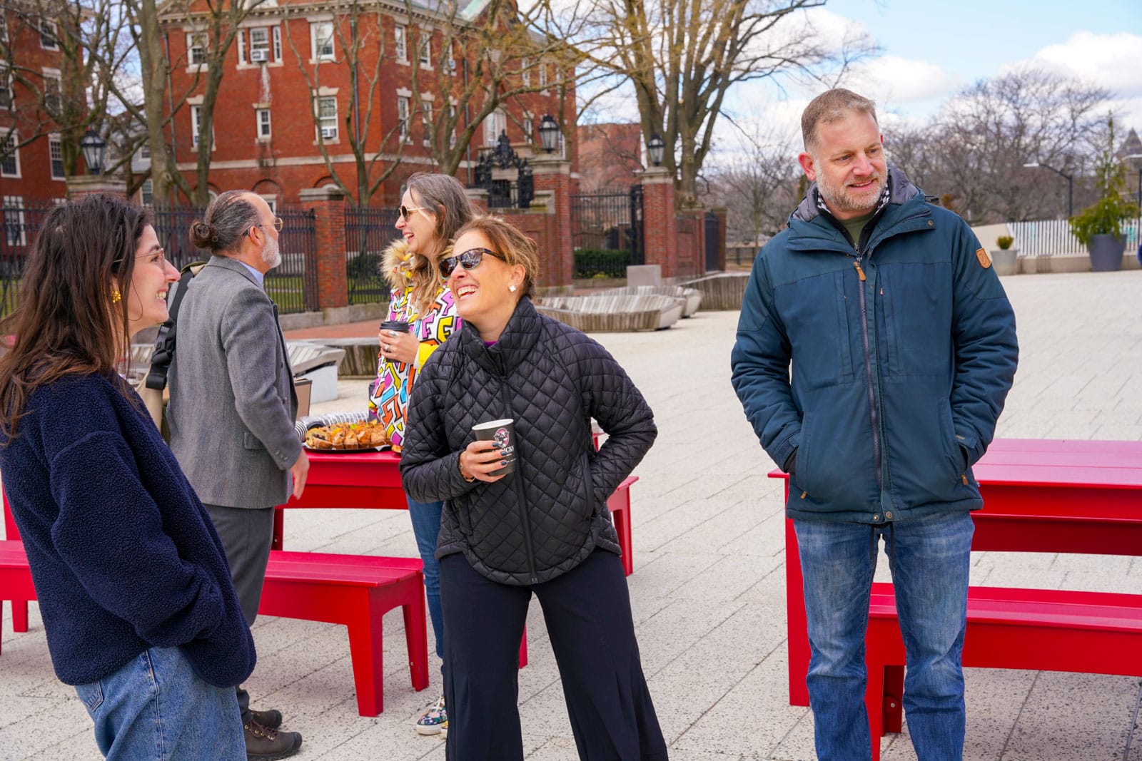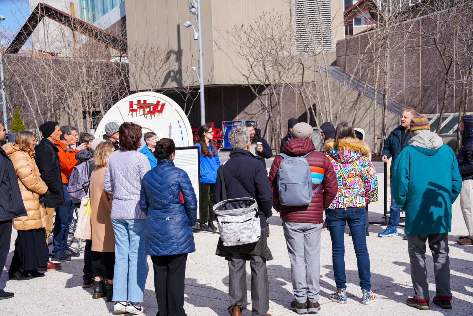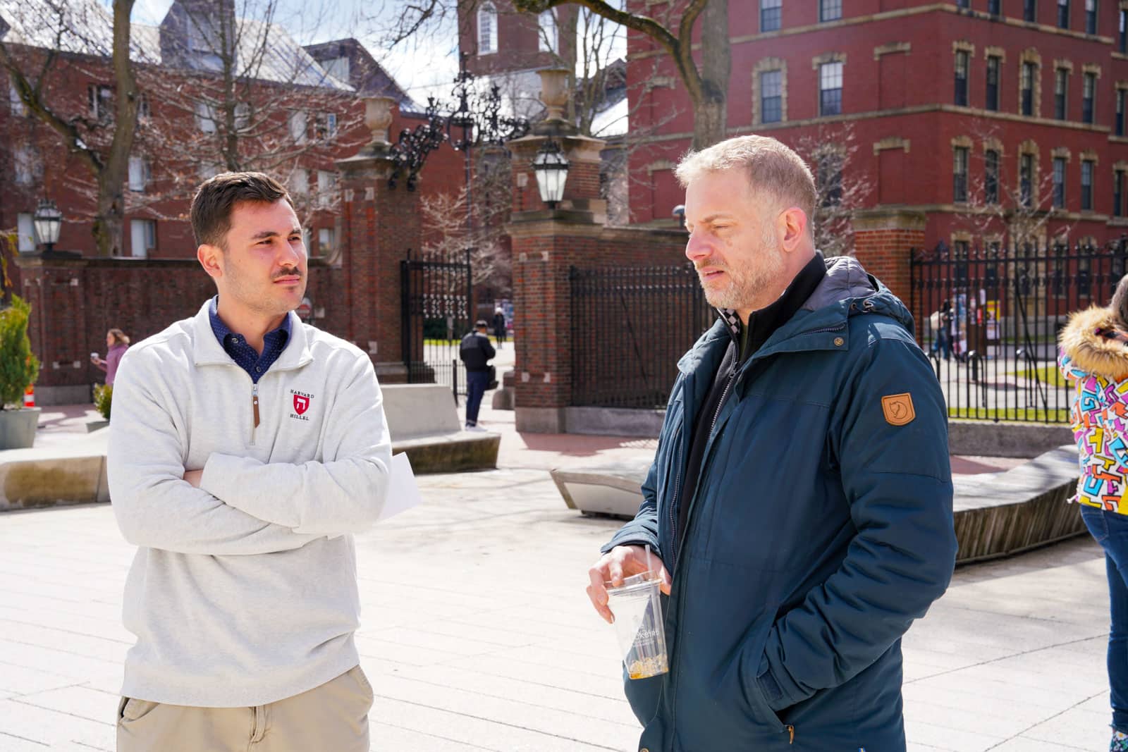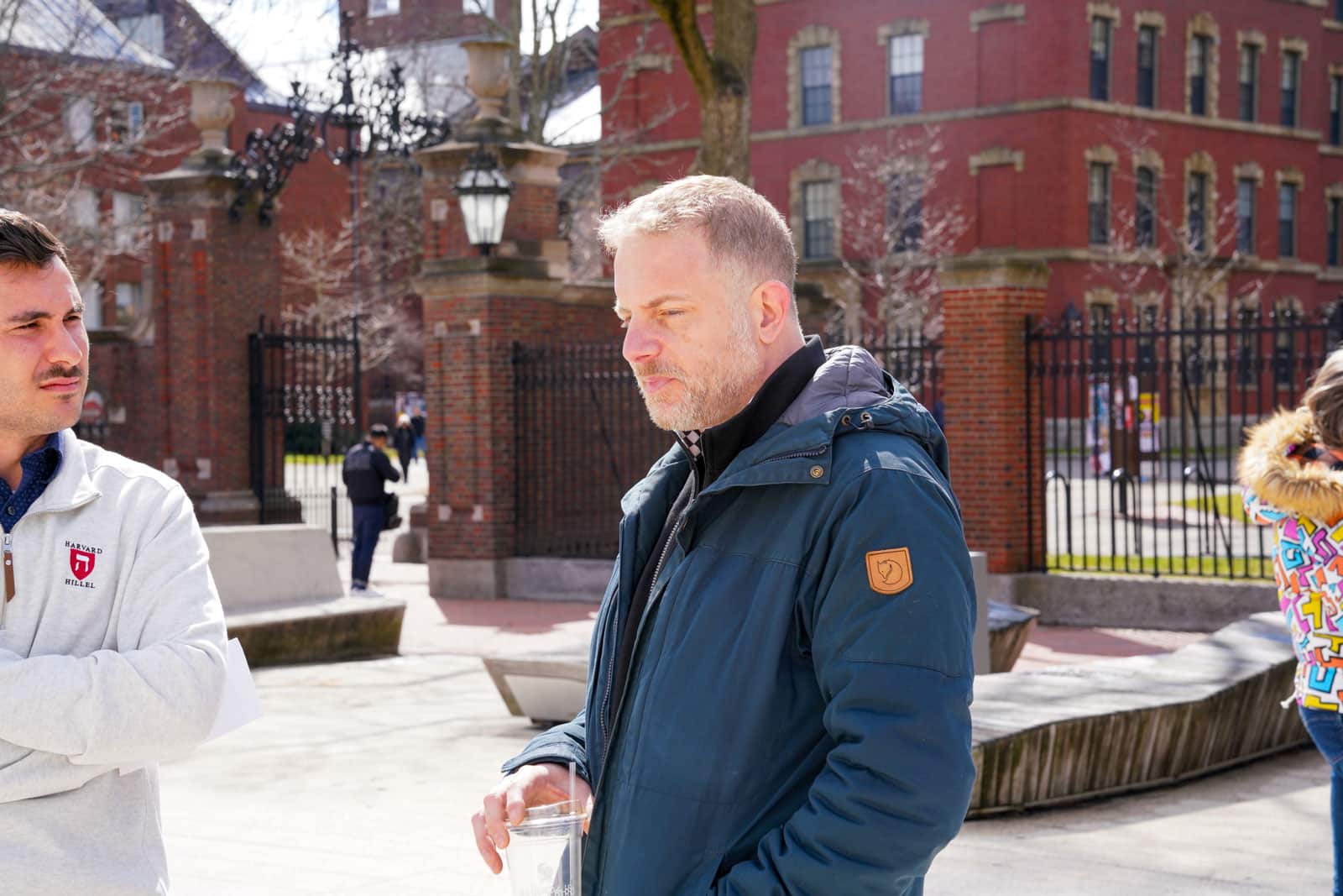 Under the morning sun and alongside the newly installed nine-foot sculpture, dozens of students, chaplains, university staff, and curious passersby stopped to engage directly with artist Michael Mittelman. Over hot coffee and pastries, the artist shared the stories behind the installation’s panels—each representing a unique thread of Jewish identity and belonging at Harvard—while neighbors and colleagues connected through shared conversation and art.