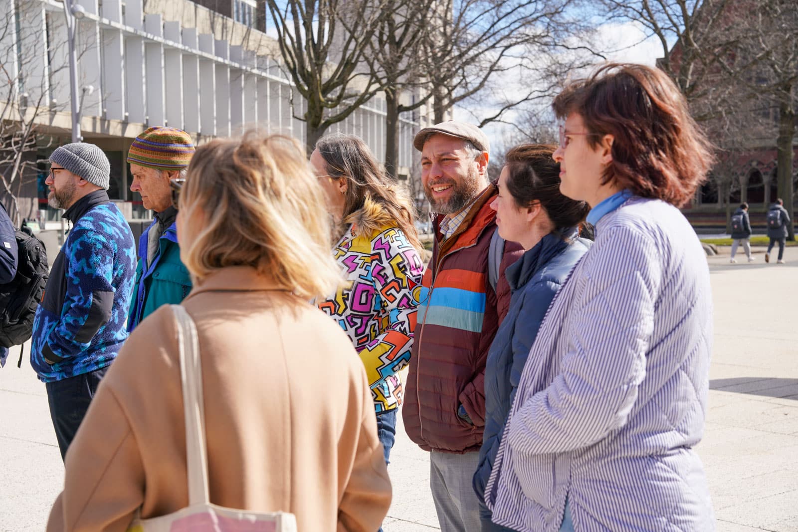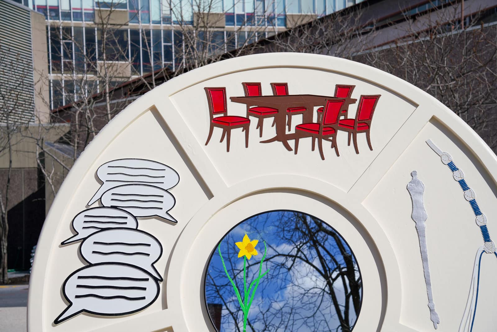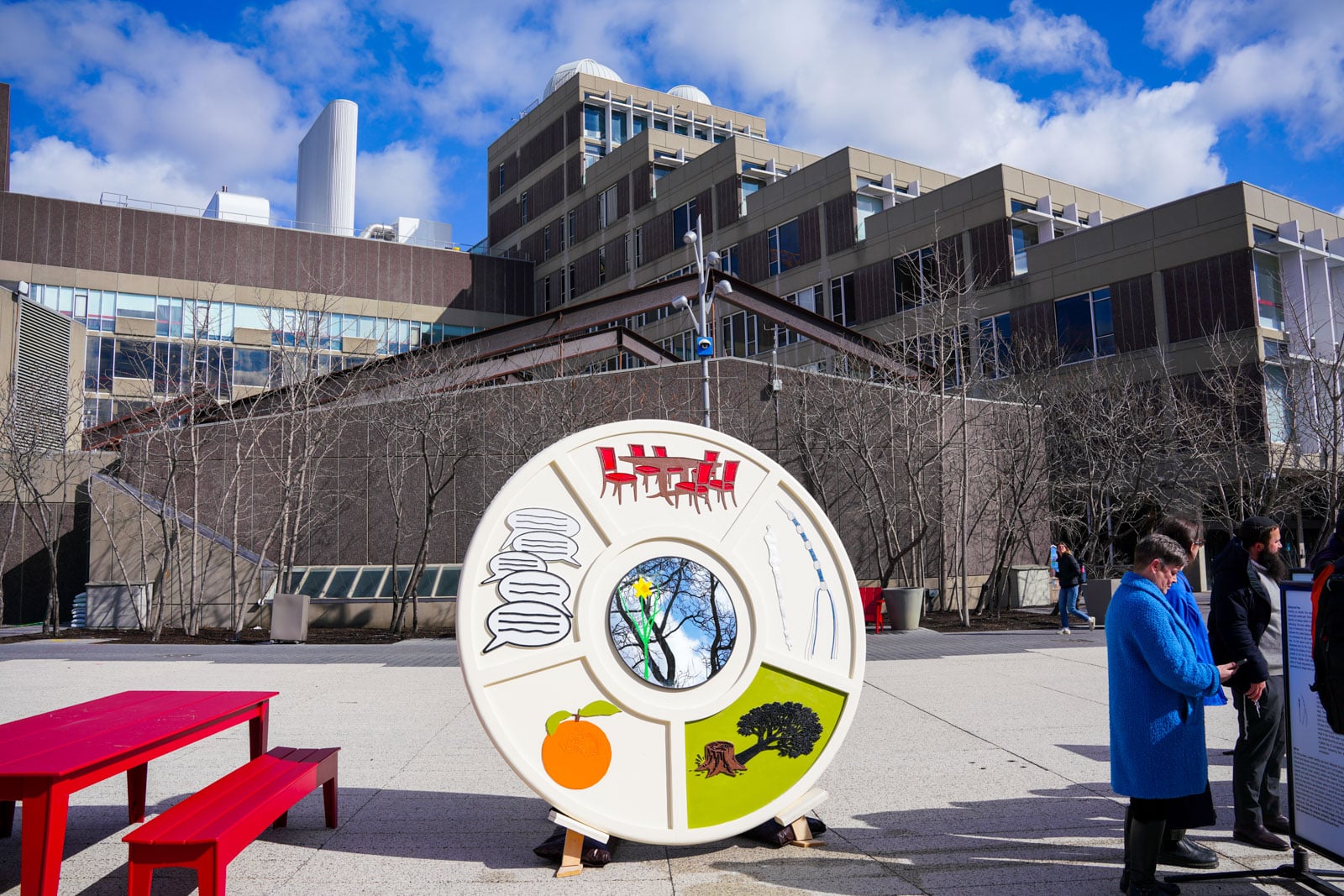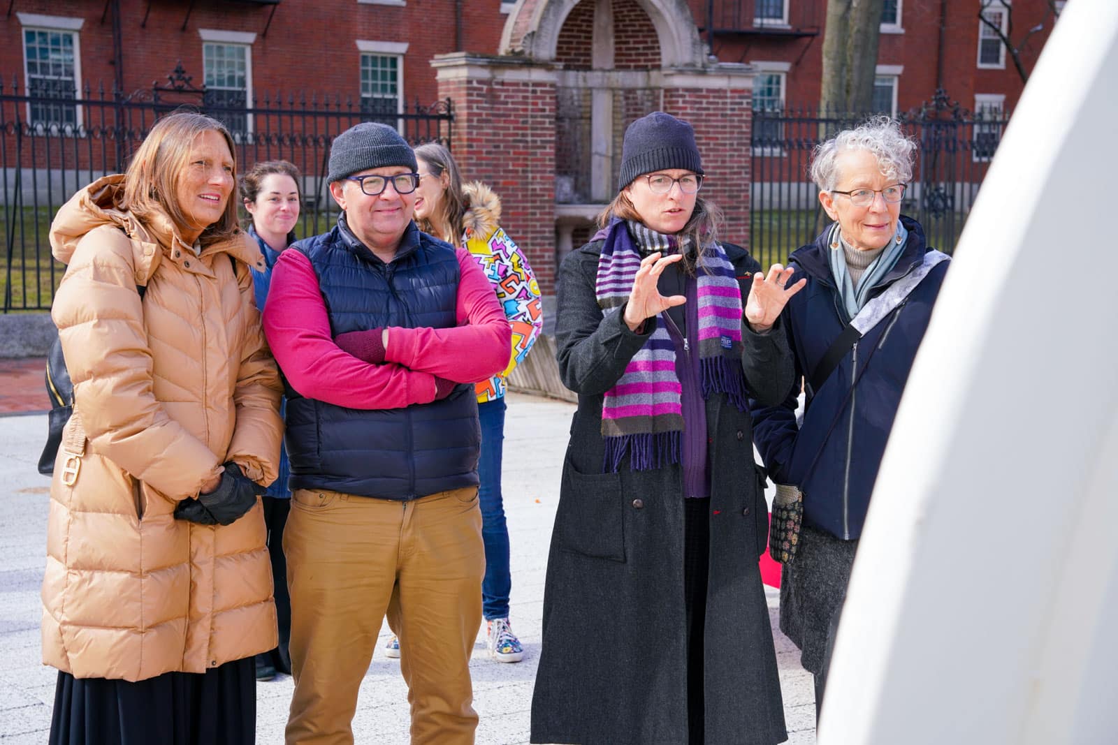 Under the morning sun and alongside the newly installed nine-foot sculpture, dozens of students, chaplains, university staff, and curious passersby stopped to engage directly with artist Michael Mittelman. Over hot coffee and pastries, the artist shared the stories behind the installation’s panels—each representing a unique thread of Jewish identity and belonging at Harvard—while neighbors and colleagues connected through shared conversation and art.